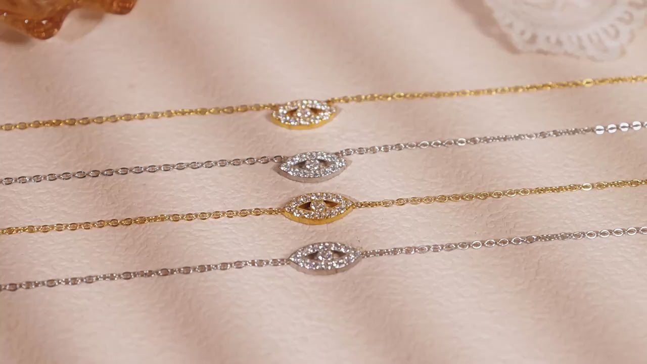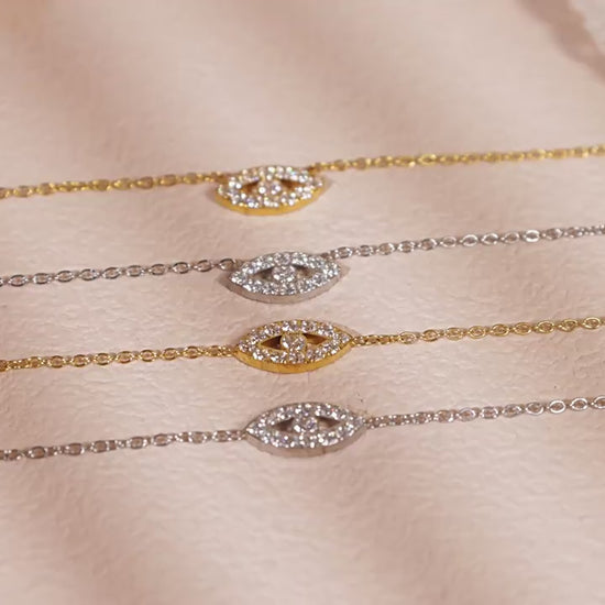 This delicate multi-row necklace with a mystical evil eye pendant captivates with sparkling 5A cubic zirconia stones. Available in luxurious gold plating or modern silver, it's a unique eye-protection piece with a stylish statement character.