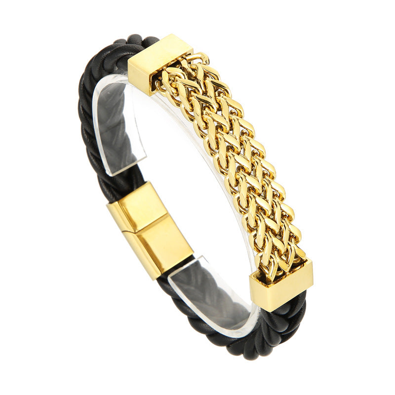 Elegant men's bracelet with two parallel rows of braided leather, connected by titanium steel chain links. The integrated magnetic clasp ensures a secure fit.