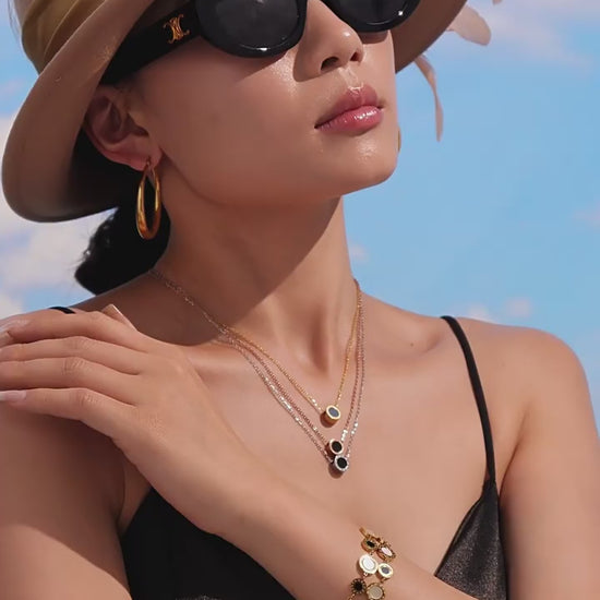 This stylish jewelry set combined natural white shells with elegant black acrylic elements in Roman numeral look. The timeless design is made of stainless steel and is available in three elegant PVD colors to choose from: