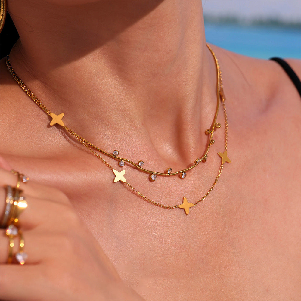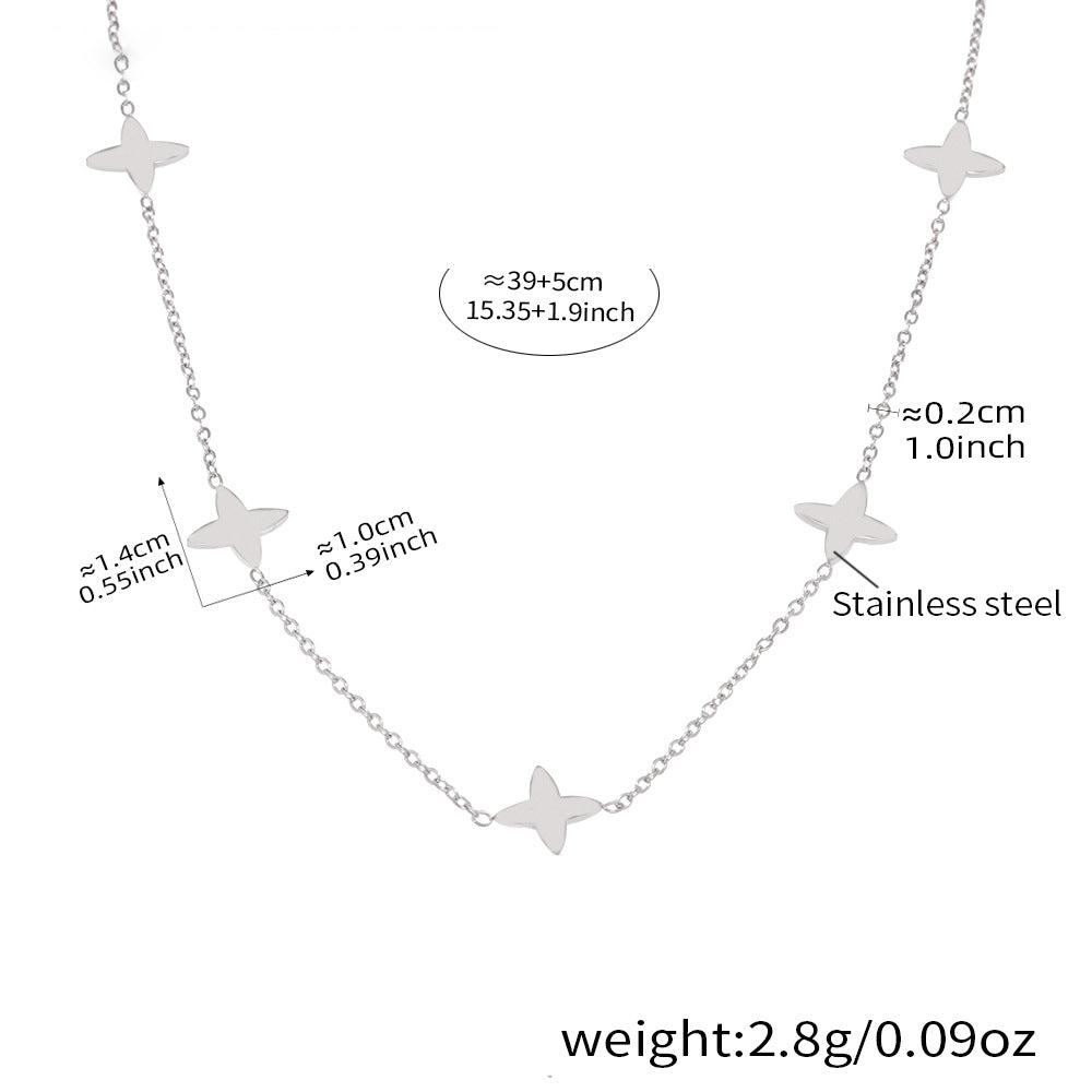 This enchanting necklace combines a four-leaf clover design with sparkling zirconia stones and delicate imitation pearls. Crafted from high-quality, nickel-free stainless steel, it's available in elegant 18K gold plating or timeless silver. Measuring 40+5 cm in length, it's ideal for layering with other necklaces.