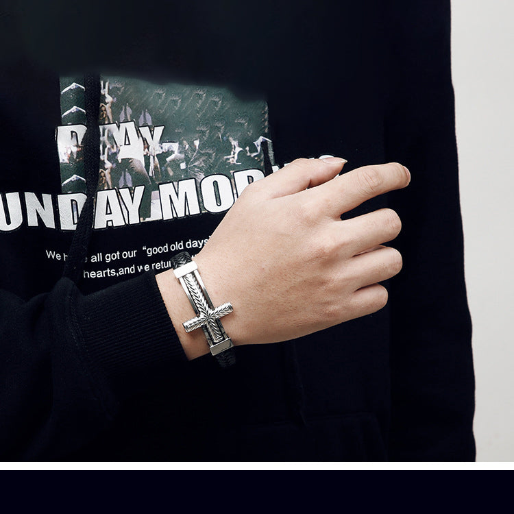 Men's braided leather bracelet with stainless steel cross – Robust men's bracelet