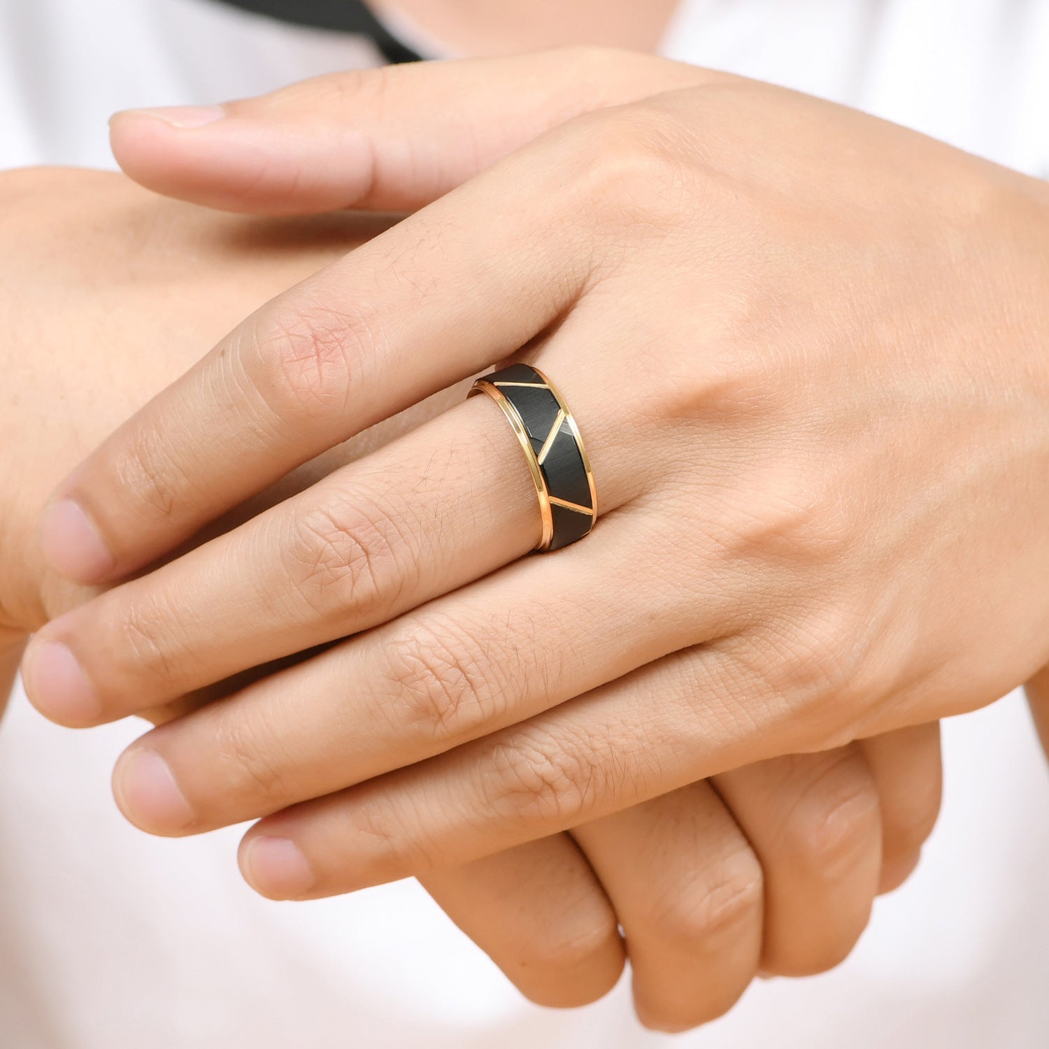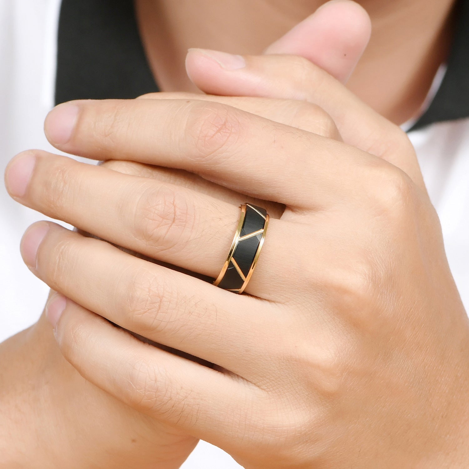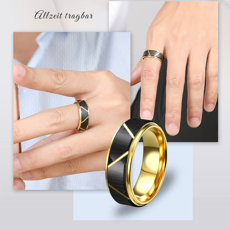 Dieser 8 mm breite Herrenring aus Wolframcarbid besticht durch sein einzigartiges 8er-Nut-Design in matt Schwarz mit goldenen Akzenten – eine perfekte Kombination aus Stärke und Eleganz.