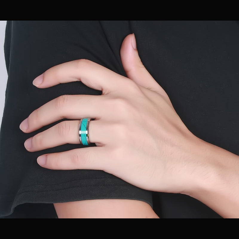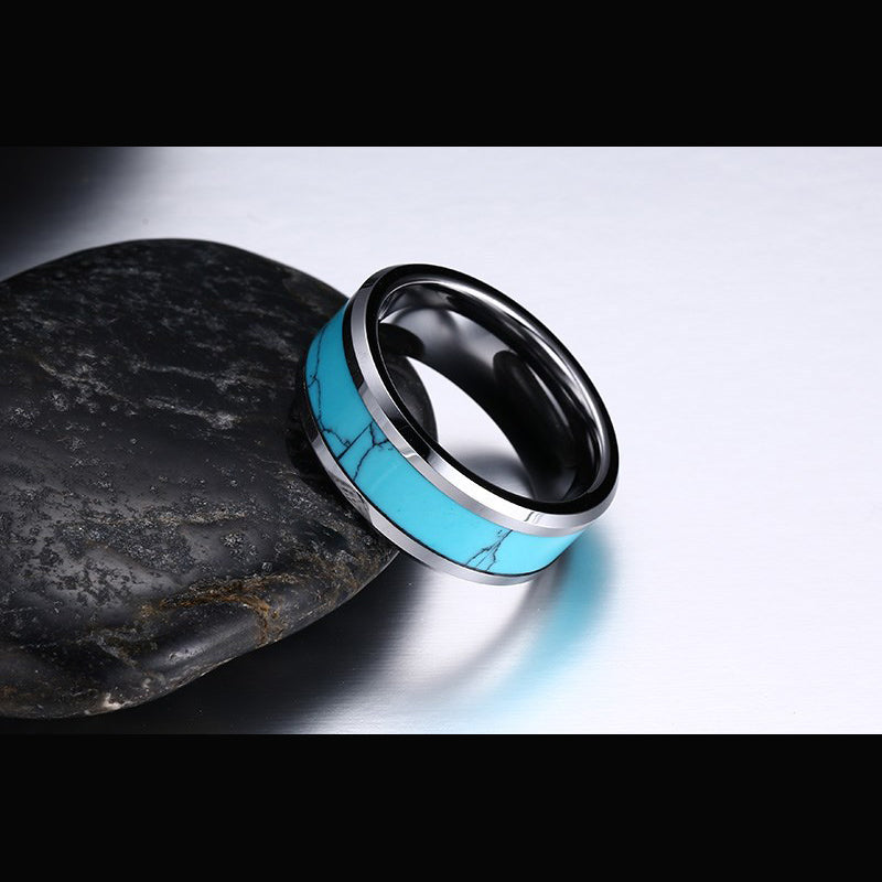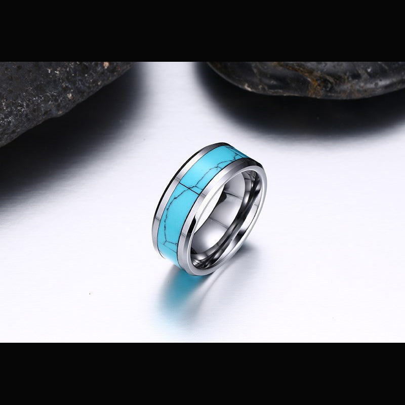 Dieser 8 mm breite Herrenring aus Wolframcarbid besticht durch sein flaches Design mit abgeschrägten Kanten und einer einzigartigen Türkiseinlage.