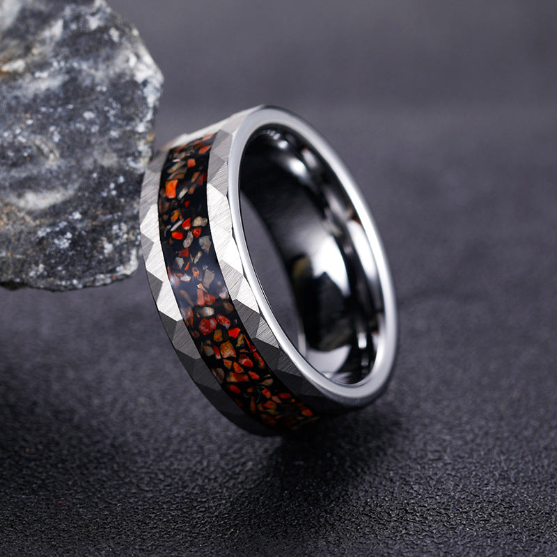 Die Verbindung von moderner Technik und urzeitlichen Materialien verleiht dem Ring einen einzigartigen Charakter.