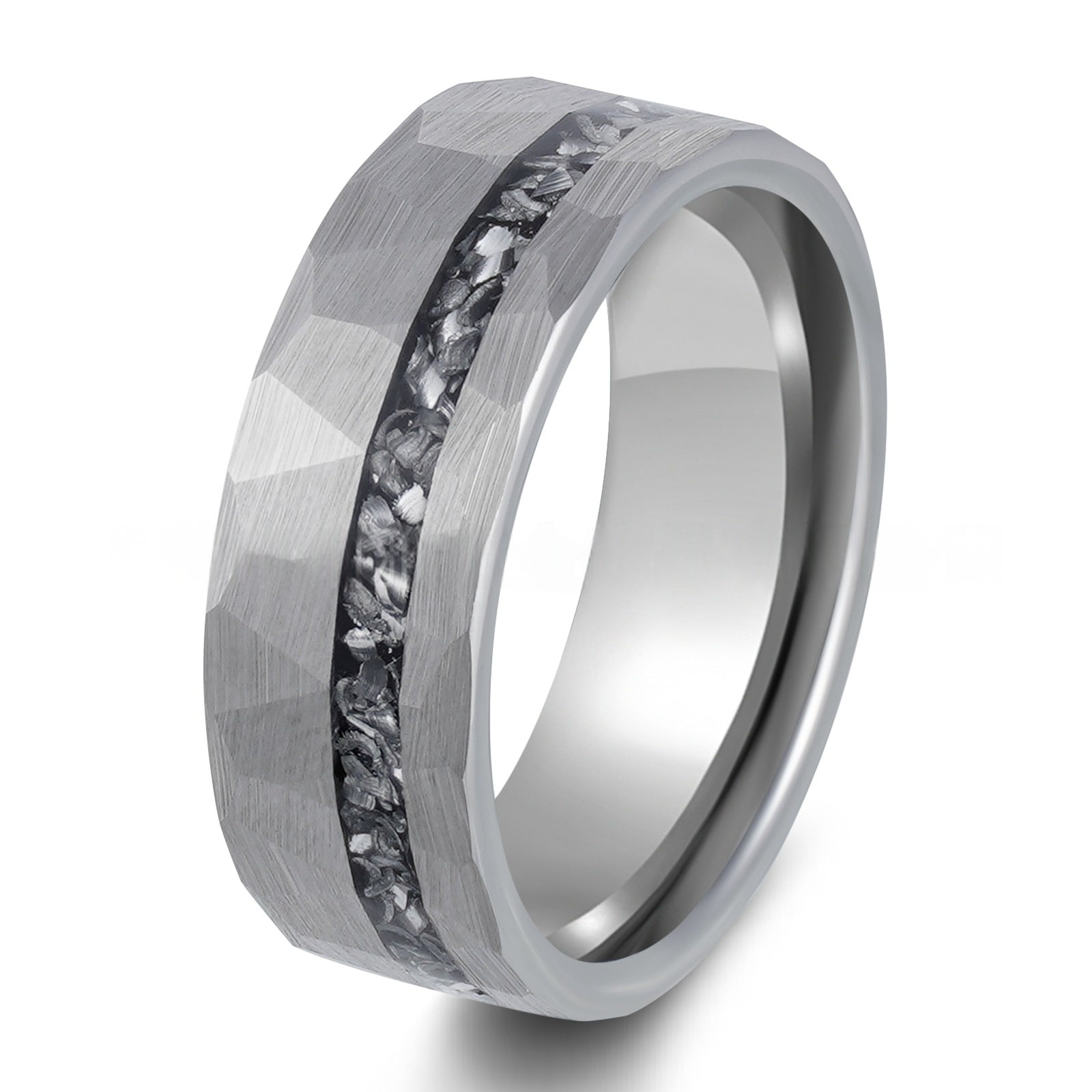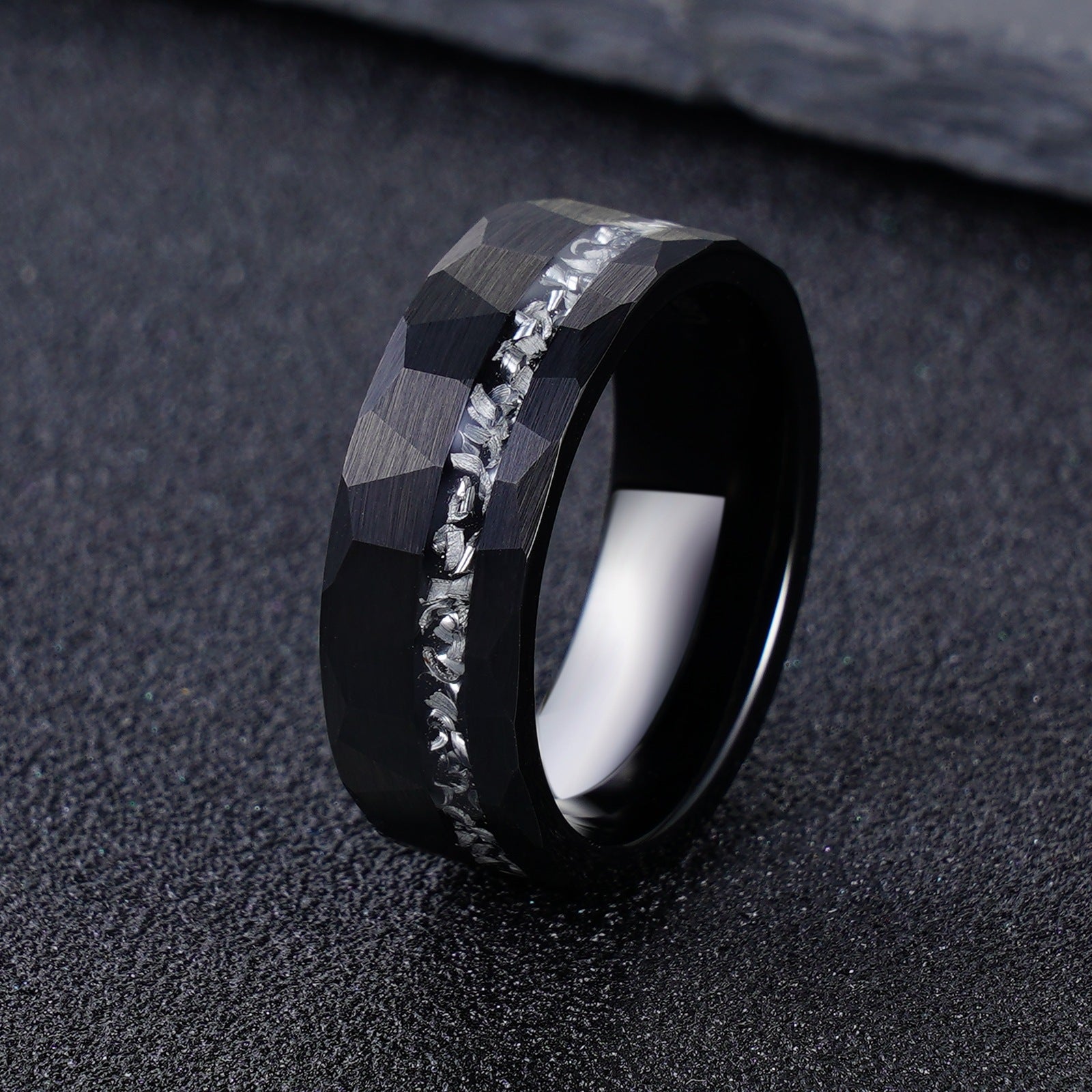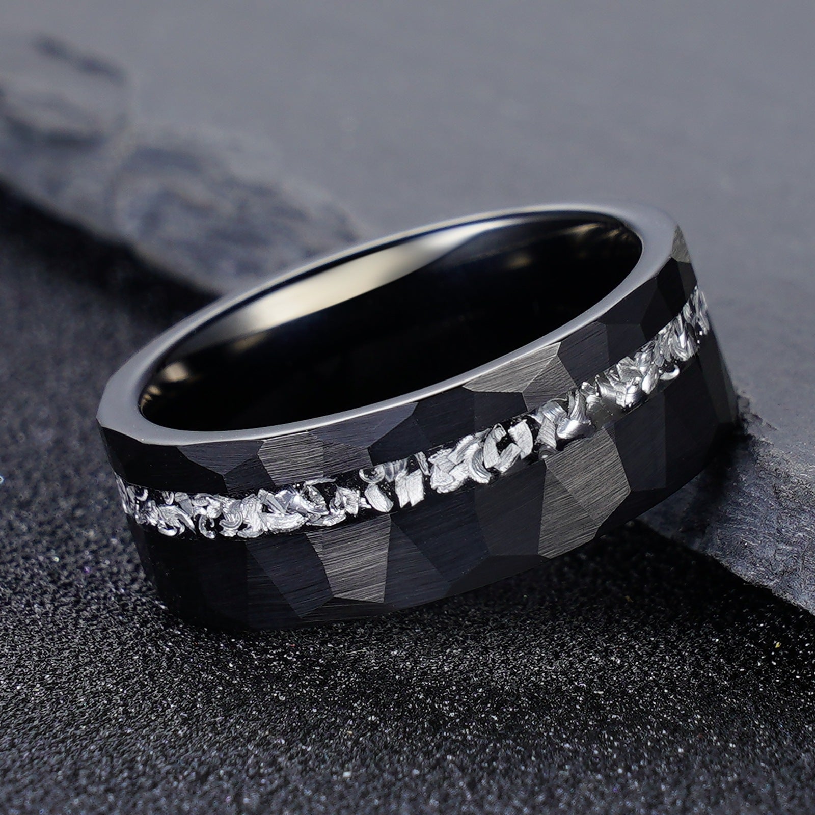 Maskuliner Wolframring mit Meteorit und Hammerschlag-Design – 8 mm Breite