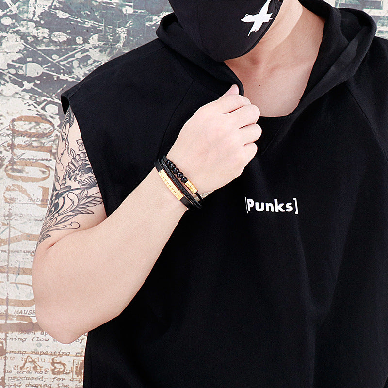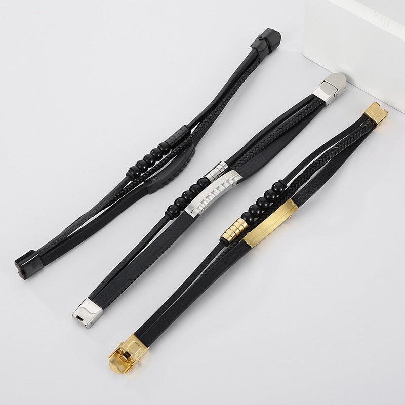 Multi-layer braided leather bracelet with stainless steel & geometric beads – Handmade unique jewelry