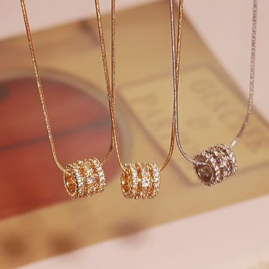 Multi-layered cylinder pendant with zirconia stones | Stainless steel chain in 18K gold or high-gloss silver