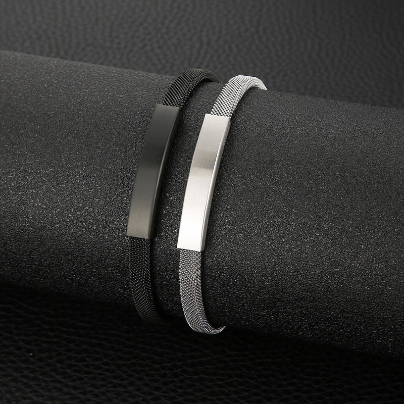 Minimalist men's stainless steel bracelet – Lightweight C-shaped mesh design with curved metal plate