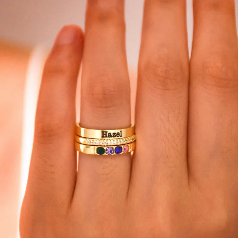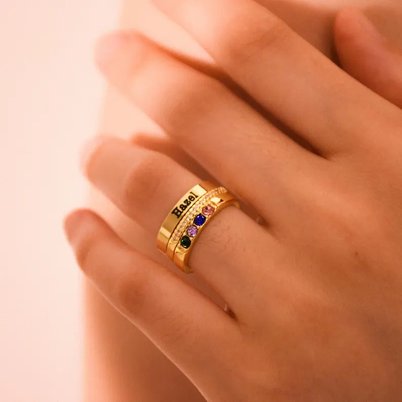 Dieser personalisierbare Damenring aus S925 Silber besteht aus drei Schichten und kann mit Geburtssteinen für alle 12 Monate individuell gestaltet werden. Jeder Stein steht für einen besonderen Moment und macht den Ring zu einem einzigartigen Geschenk.